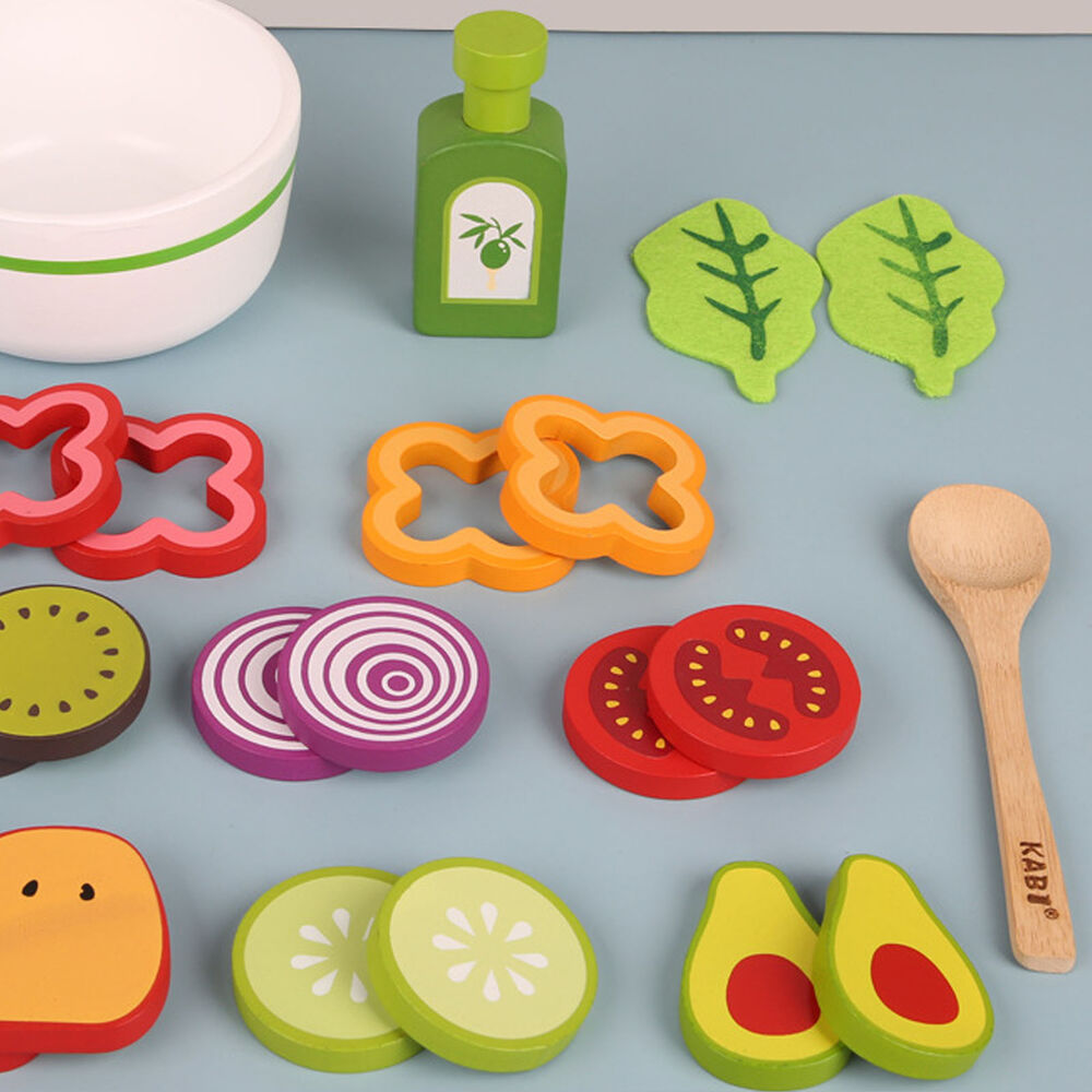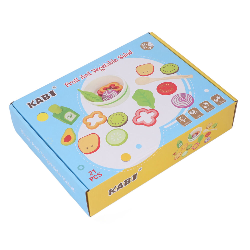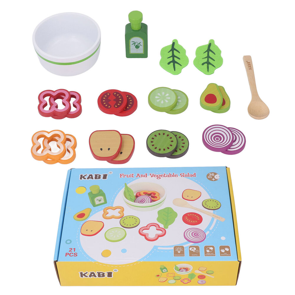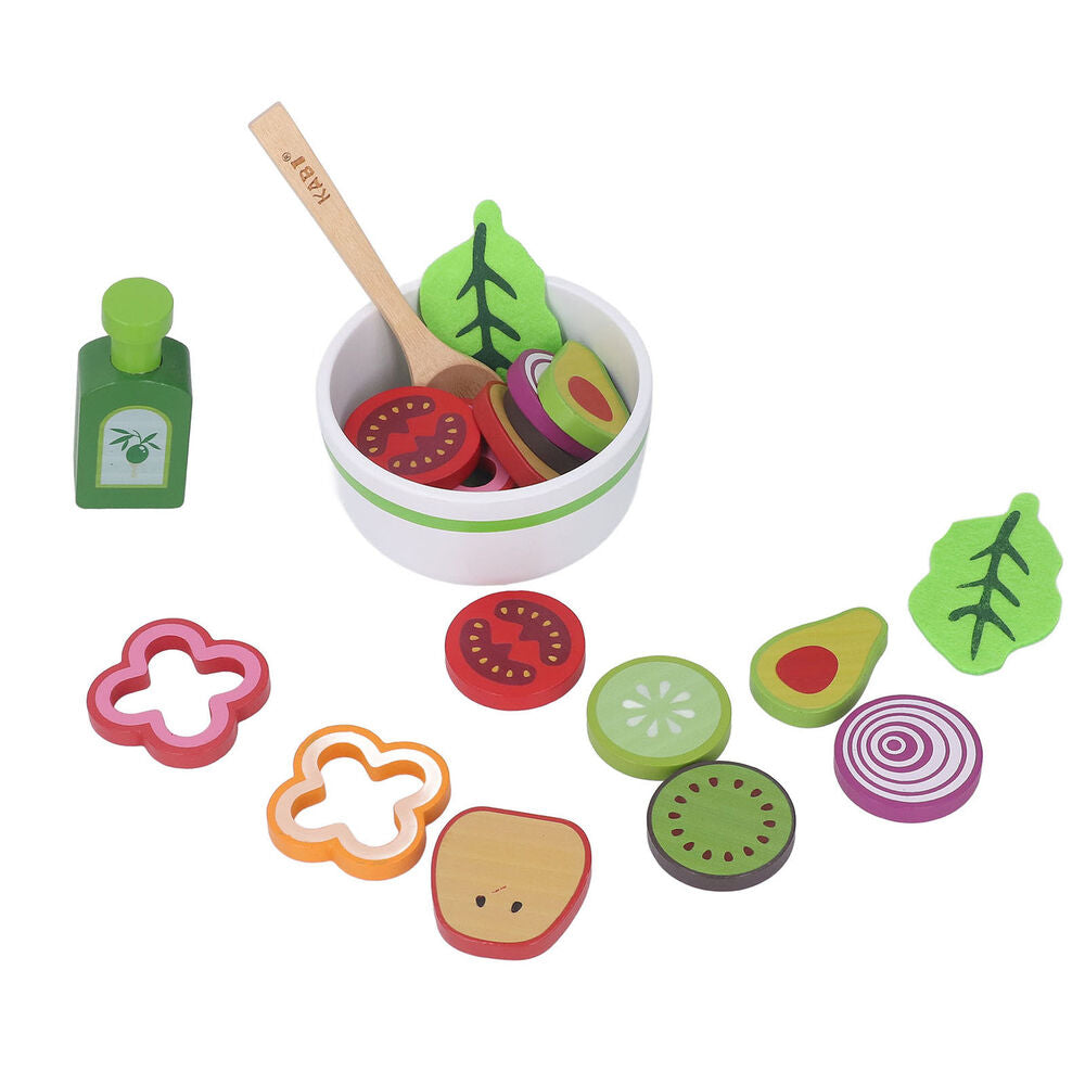 Разпалете интереса на детето си към салатите и здравословните ястия и му осигурете часове забавление и игра с въображение с дървения комплект за зеленчукова и плодова салата KABI! Идеално допълнение към всяка кухня за игра!