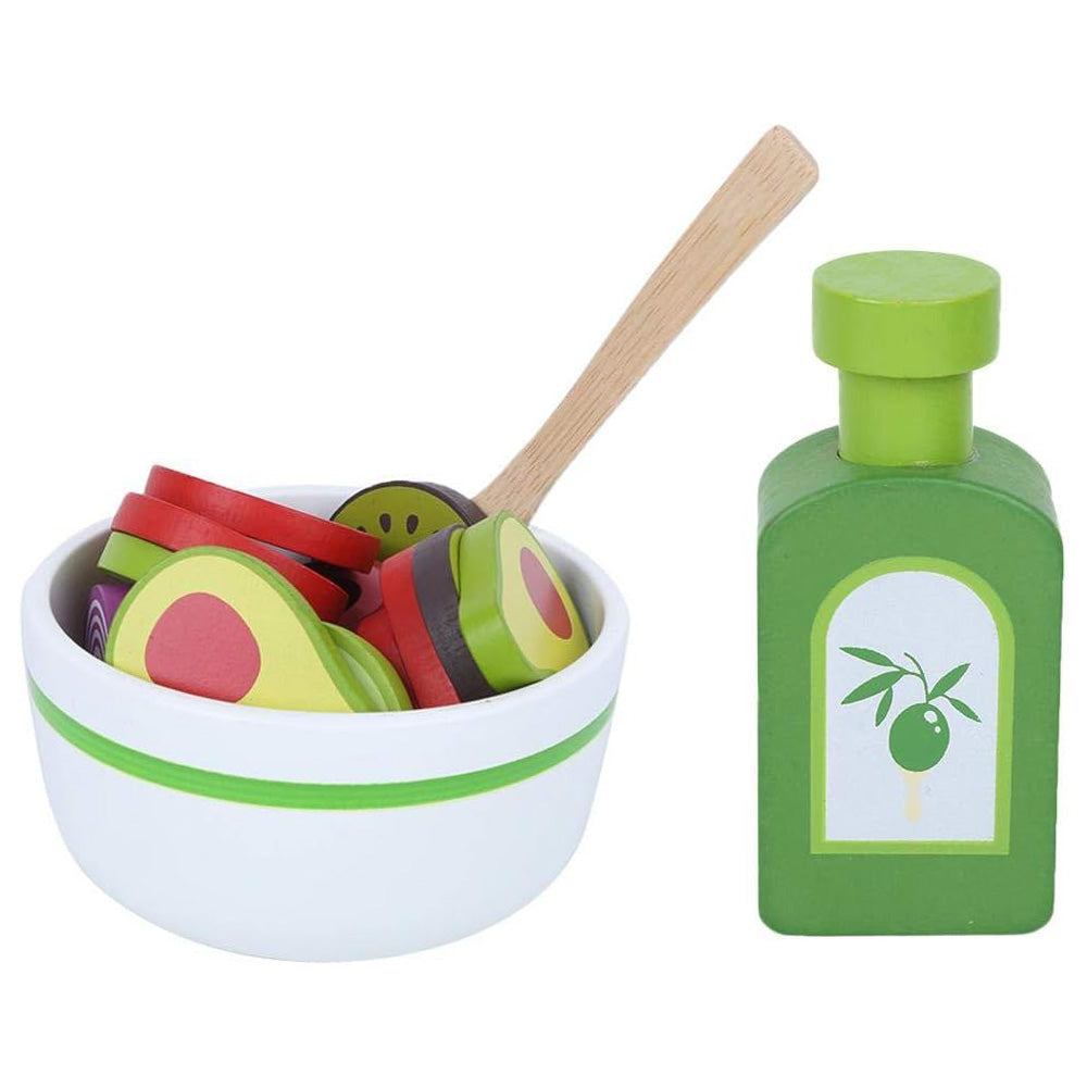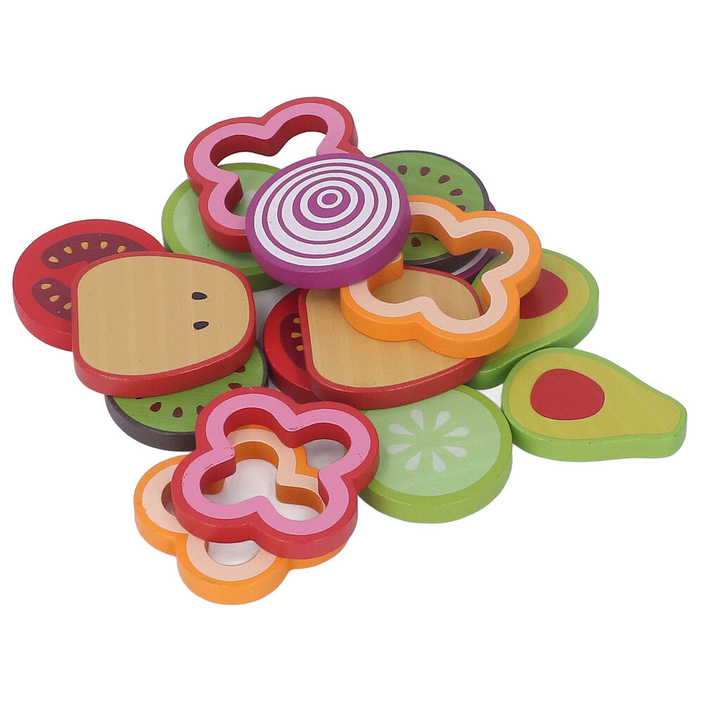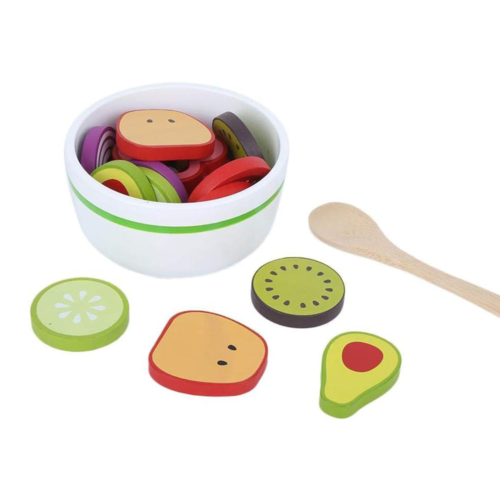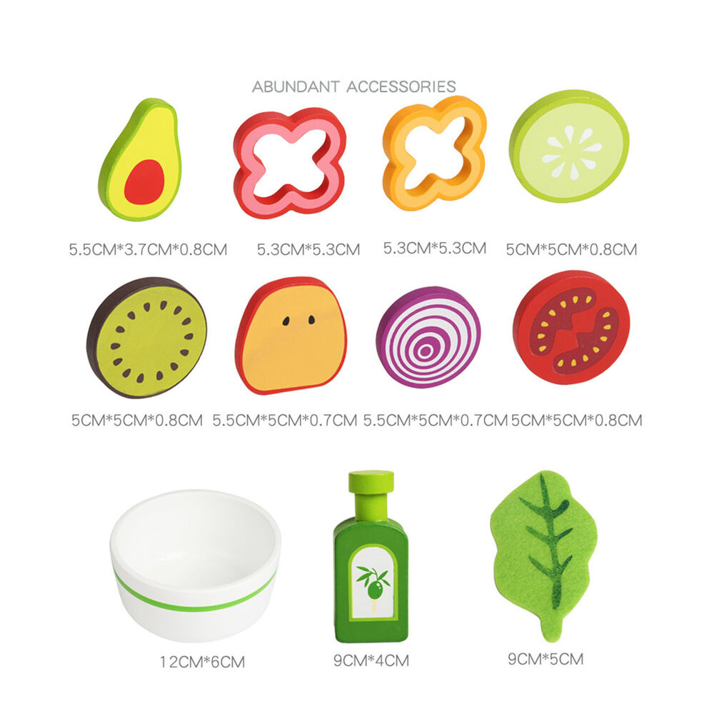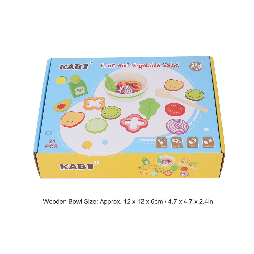 Разпалете интереса на детето си към салатите и здравословните ястия и му осигурете часове забавление и игра с въображение с дървения комплект за зеленчукова и плодова салата KABI! Идеално допълнение към всяка кухня за игра!