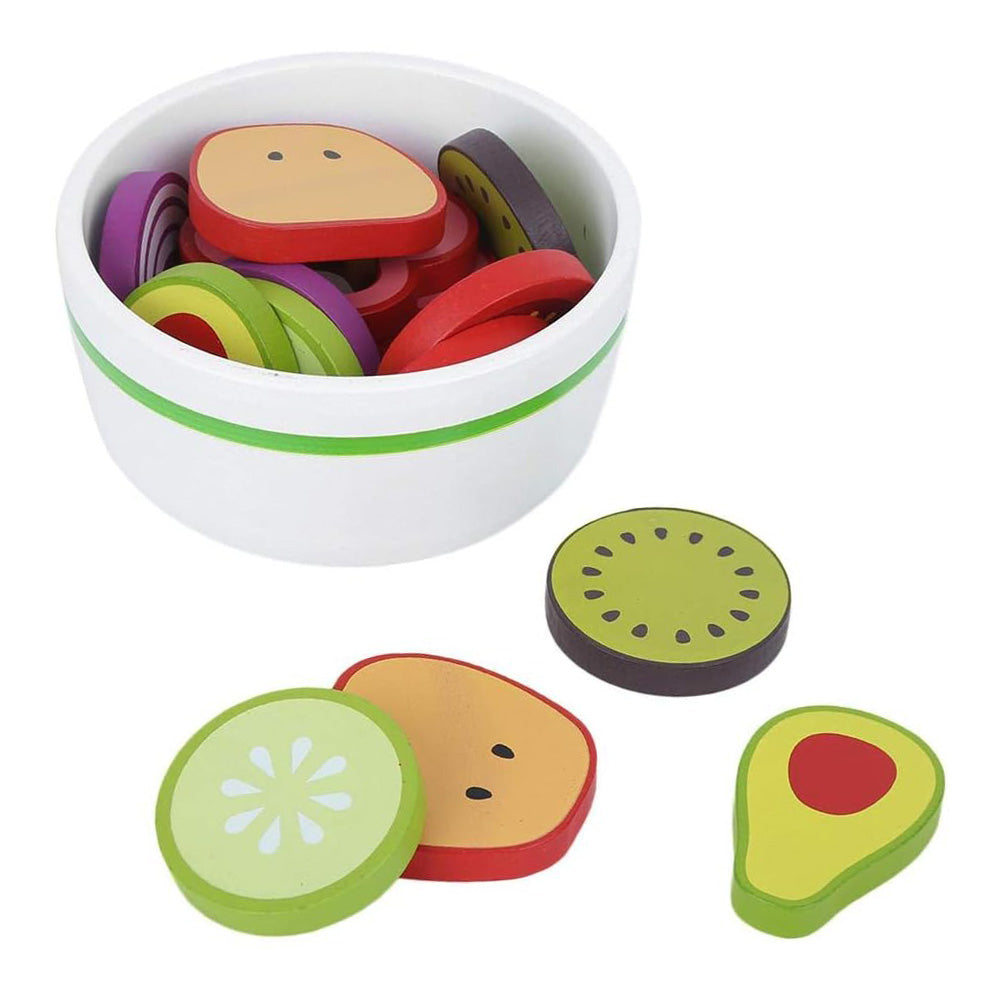 Представяме дървена Монтесори игра, купа за салата и съставки (нарязани зеленчуци и плодове) за закуска, практическа ролева игра в кухнята за малките.