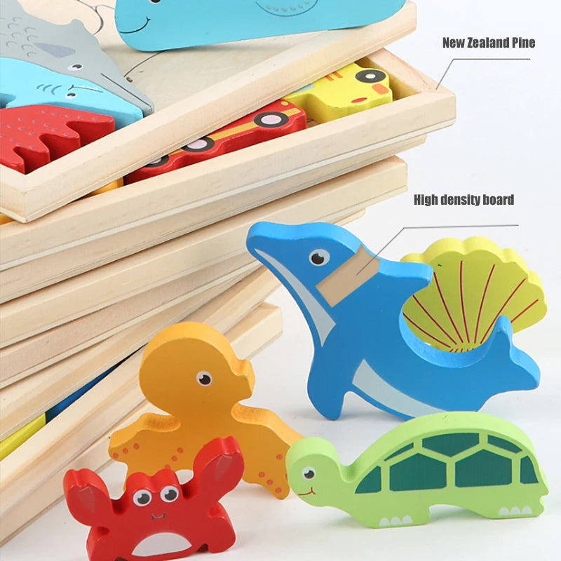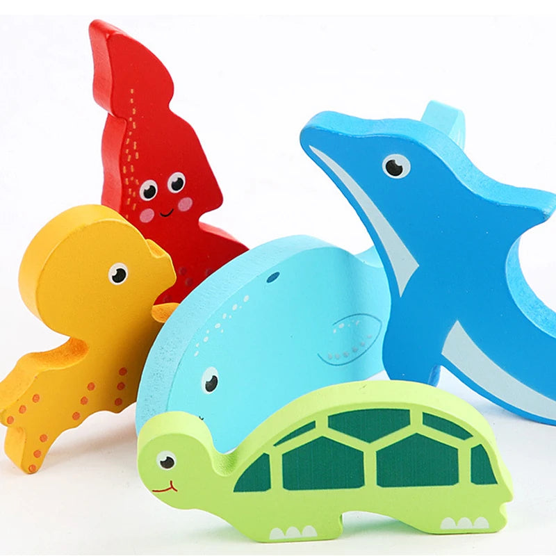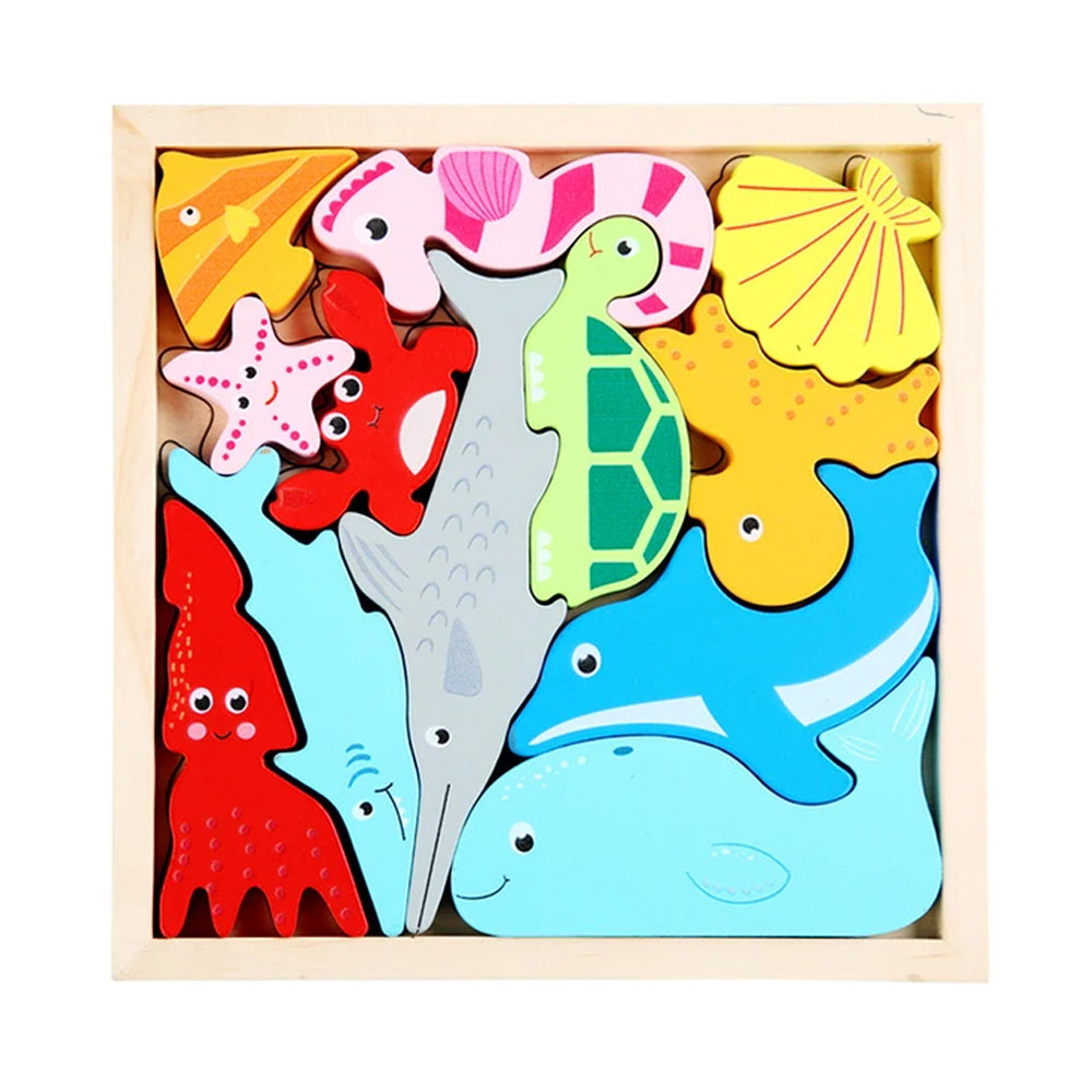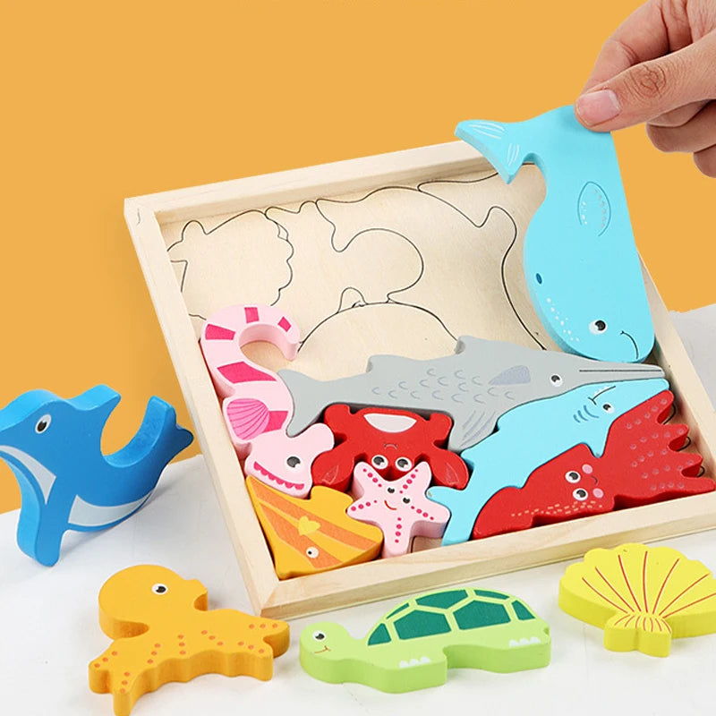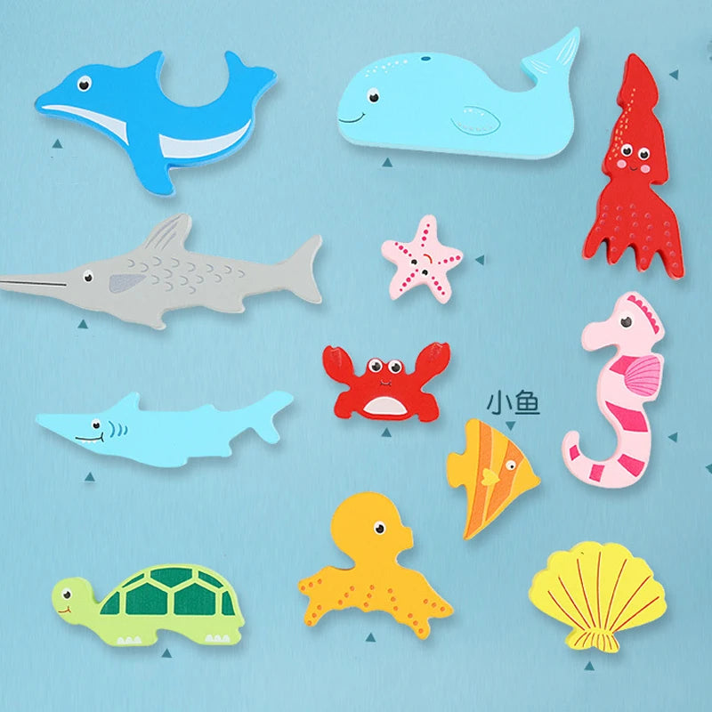 Пъзел с дебели части във формата на морски животни, които се побират в дървен поднос. Играта е съставена от 12 части във формата на морски животни, боядисани в живи цветове, които могат лесно да се комбинират от малчуганите.