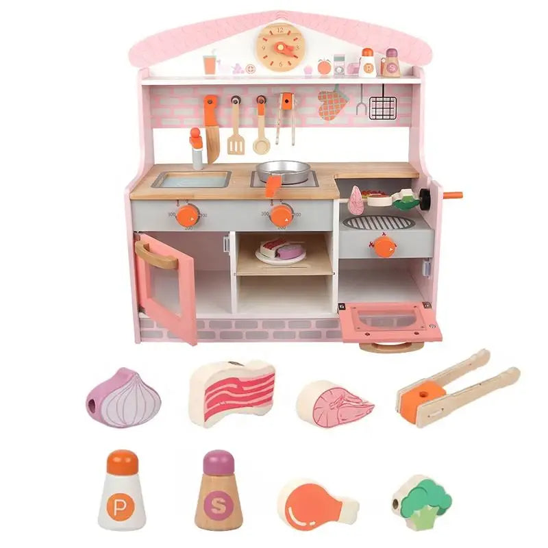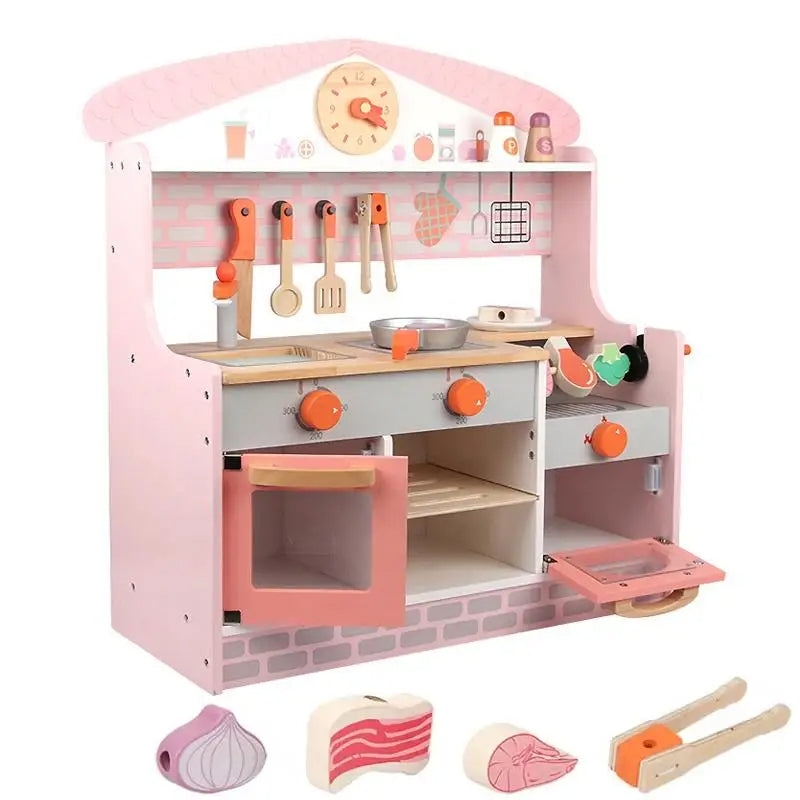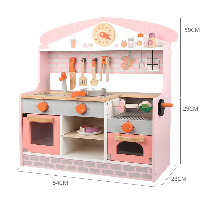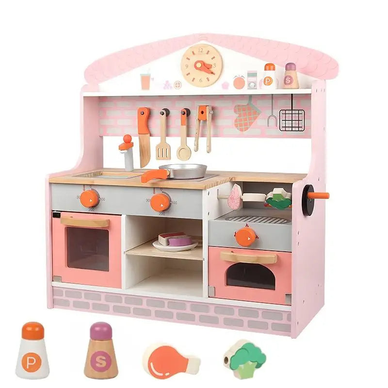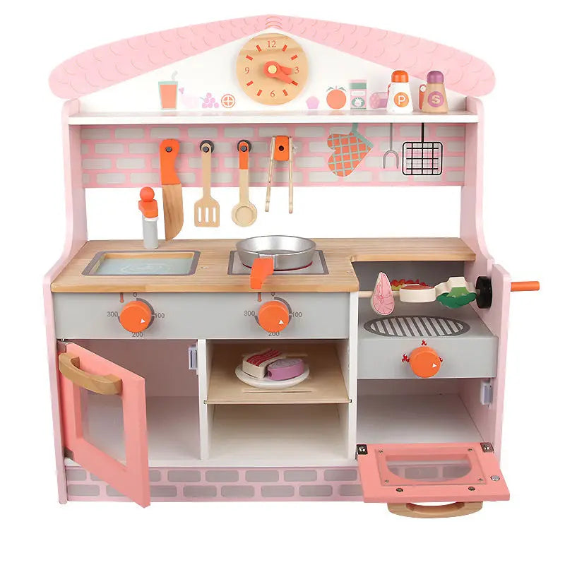 Va prezentam o superba bucatarie din lemn pentru cei mici, dotata complet cu cuptor, plita, gratar pentru barbeque, precum si nenumarate accesorii sa ii insoteasca in jocul de rol.