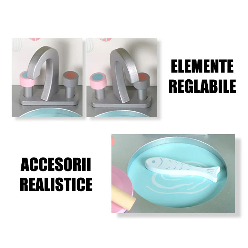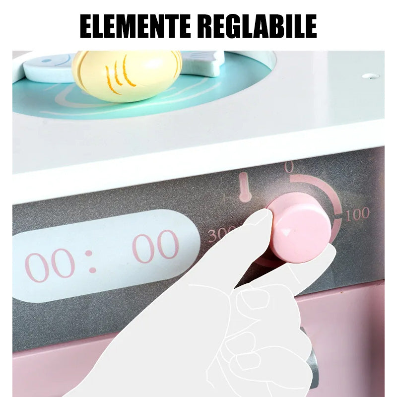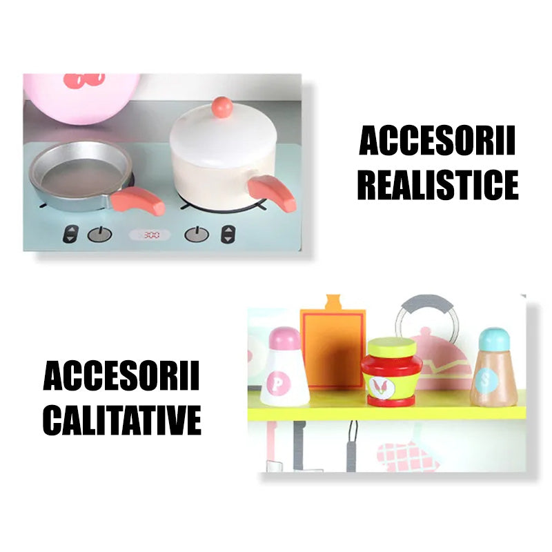 Realizata din lemn cu finisaje de calitate si linii de design moderne, aceasta bucatarie le va oferi celor mici nenumarate ore de distractie neintrerupta!