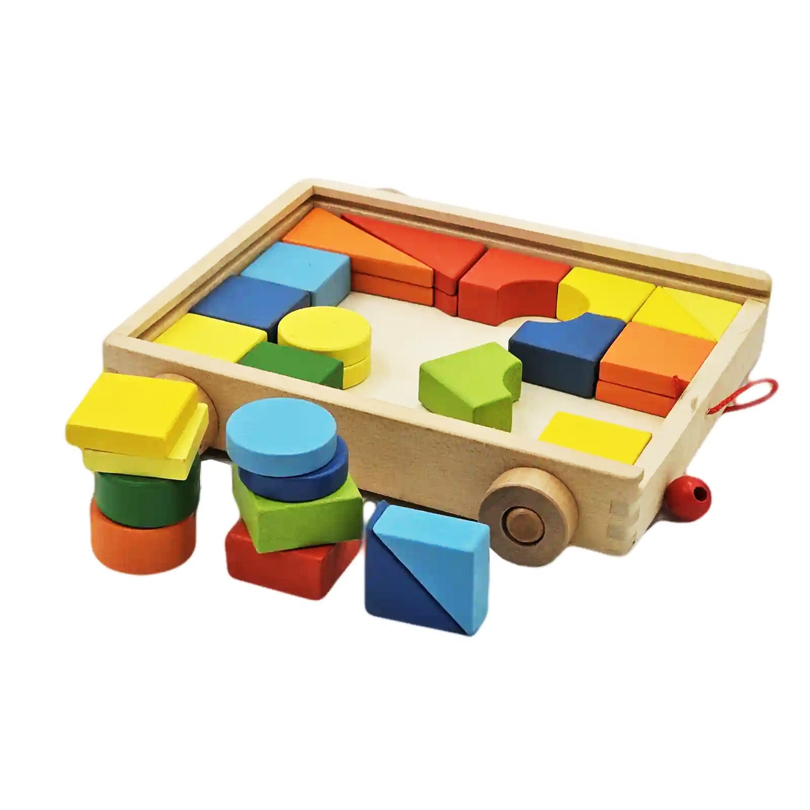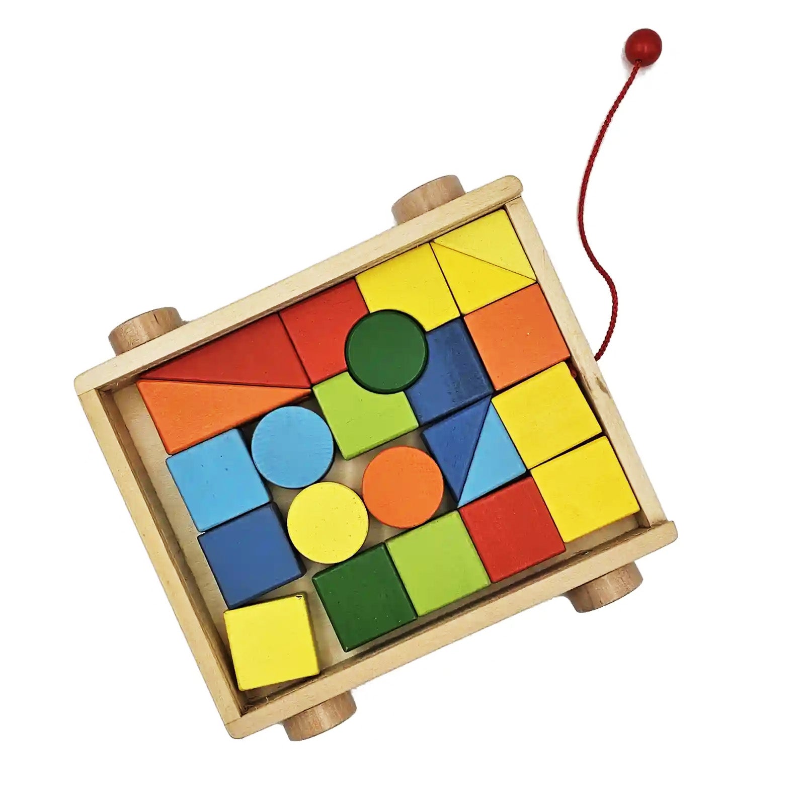 Joc de constructie cu piese din lemn, Carucior De Tras cu 29 de forme geometrice de stivuit, multicolore. Cuburi din lemn colorate, realizate in diverse forme geometrice: dreptunghi, triunghi, cilindru.