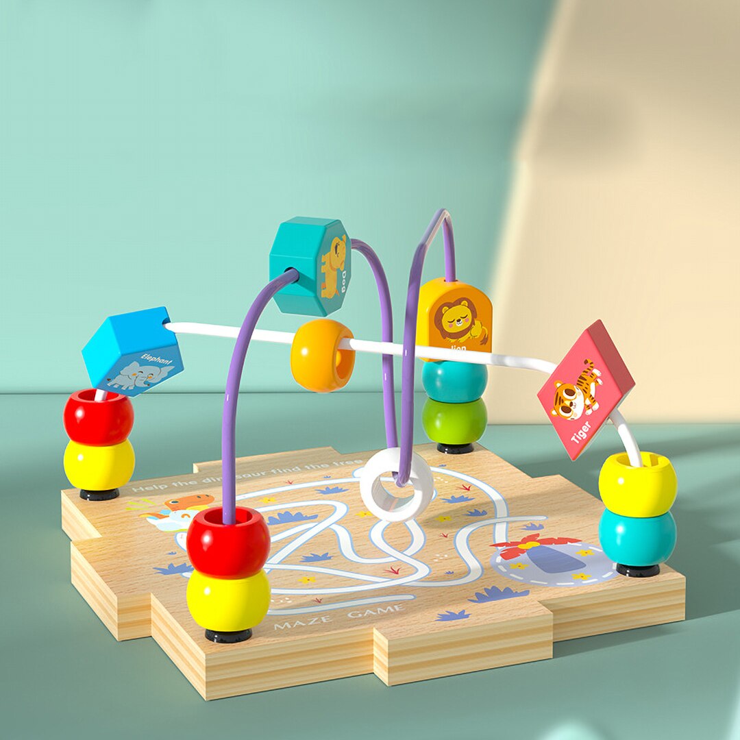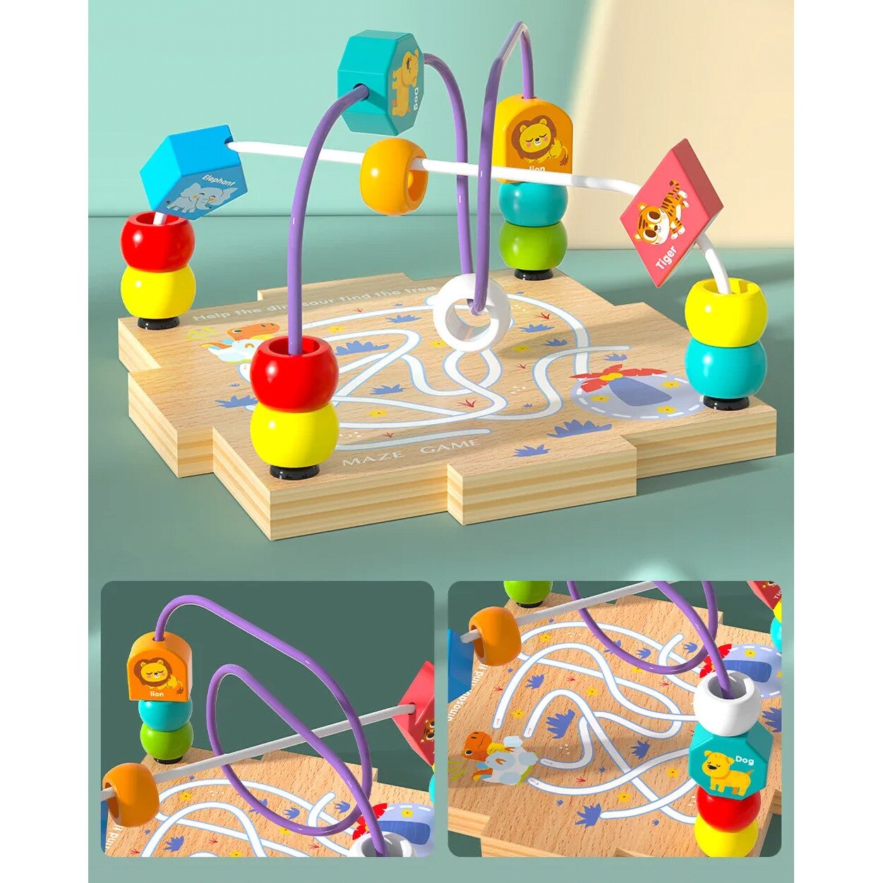 - Partea superioara contine un labirint 3D cu bile si forme ilustrate cu animale, tip Montessori, pentru dezvoltarea motricitatii fine