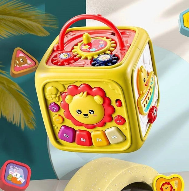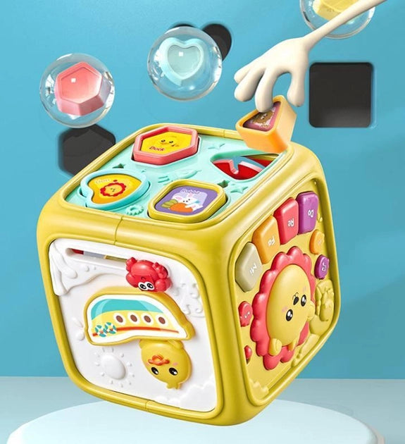 Fiecare fateta a cubului reprezinta cate o activitate. Copiii mici, bebelusii adora sa sorteze forme. Acestea cad in interiorul cubului si apoi vor fi descoperite deschizand usita de pe latura respectiva. Lumini, sunete, numeroare activitati – o jucarie completa ce poate fi facuta cadou!