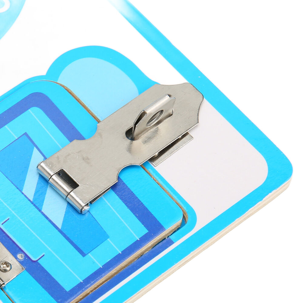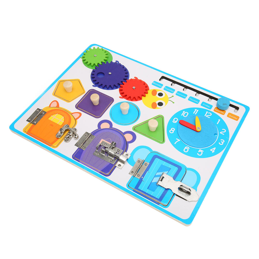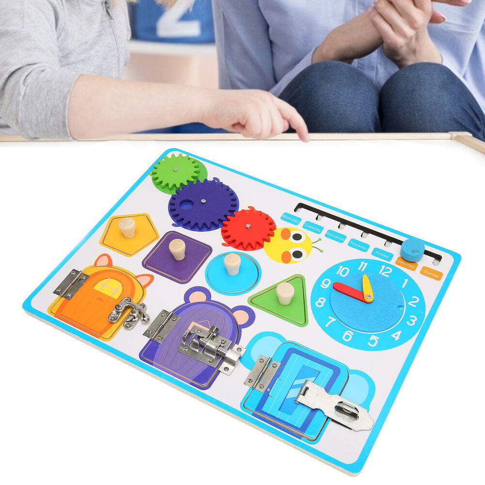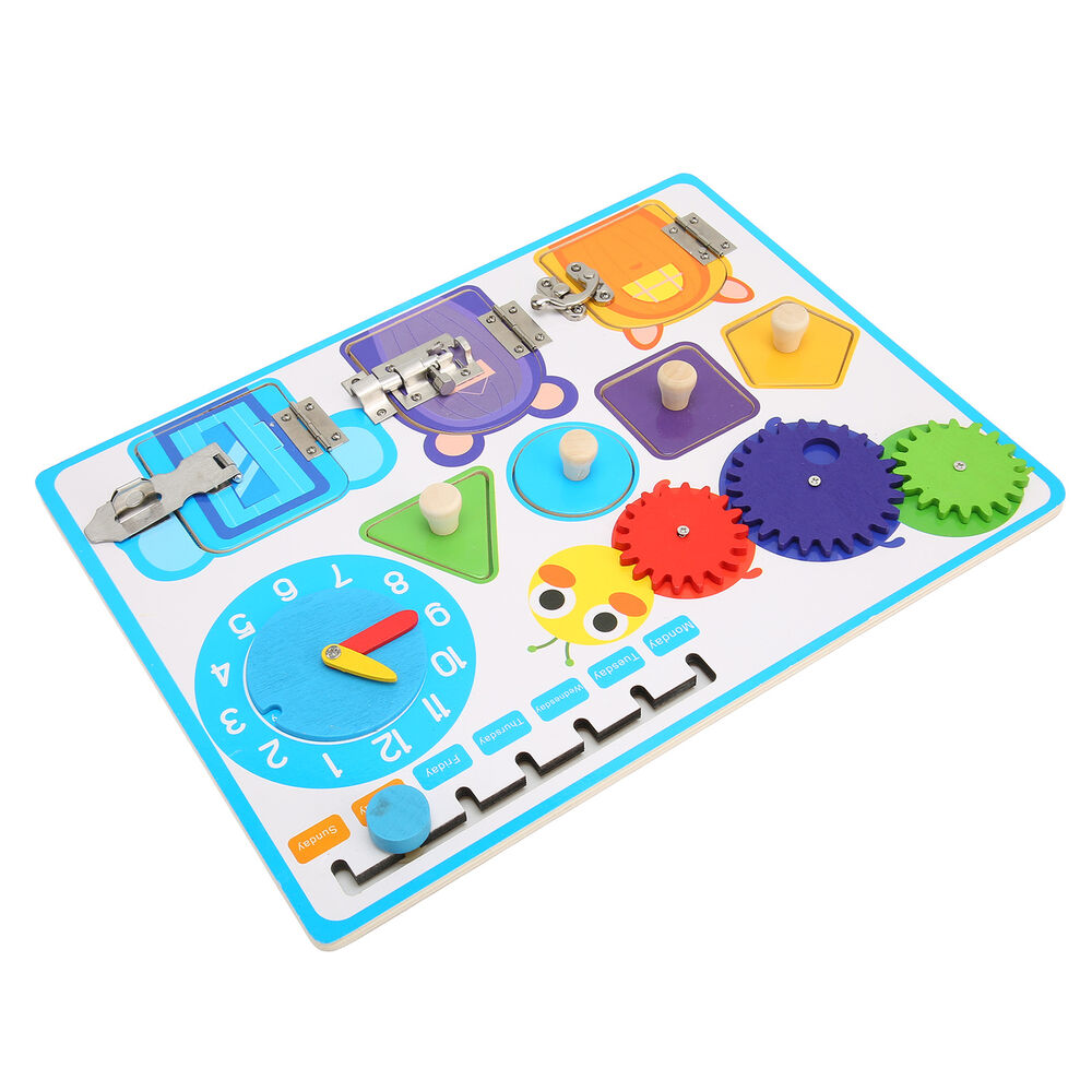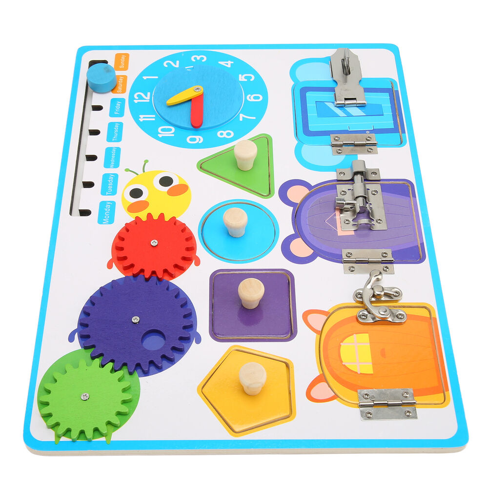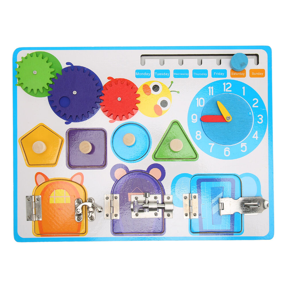 Placa contine 3 usite si incuietori diferite, ce ascund imagini cu animale simpatice, 4 forme geometrice de tip puzzle incastru cu maner, care la fel ascund 4 animalute dragalase, un ceas cu limbi mobile, un sistem de roti dintate si un calendar cu zilele saptamanii in Limba Engleza.