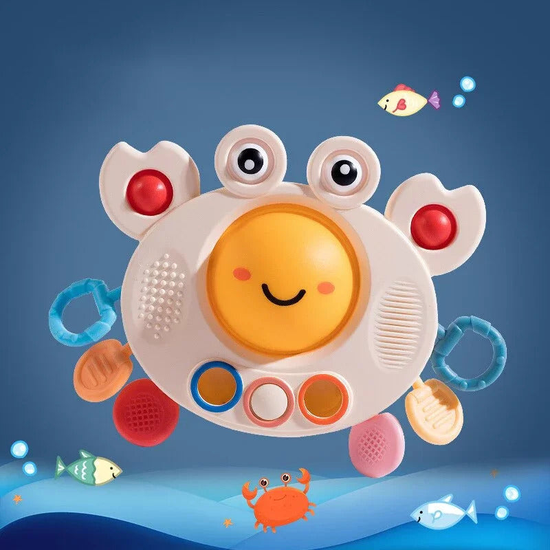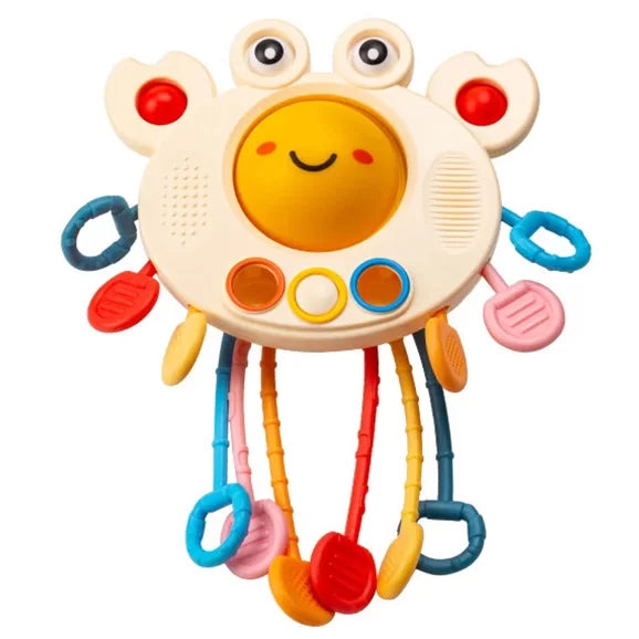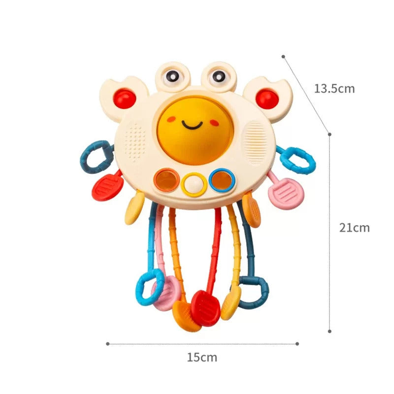 Jucarii senzoriale pentru bebelusi: bebelusul exploreaza aceasta jucarie senzoriala in forma de crab prin diferitele sunete si vibratii generate de tragerea in sus si in jos, apasare, mestecare, scuturare, iar cordoanele moi, cu textura diferita, sunt mai usor de inteles pentru copil.