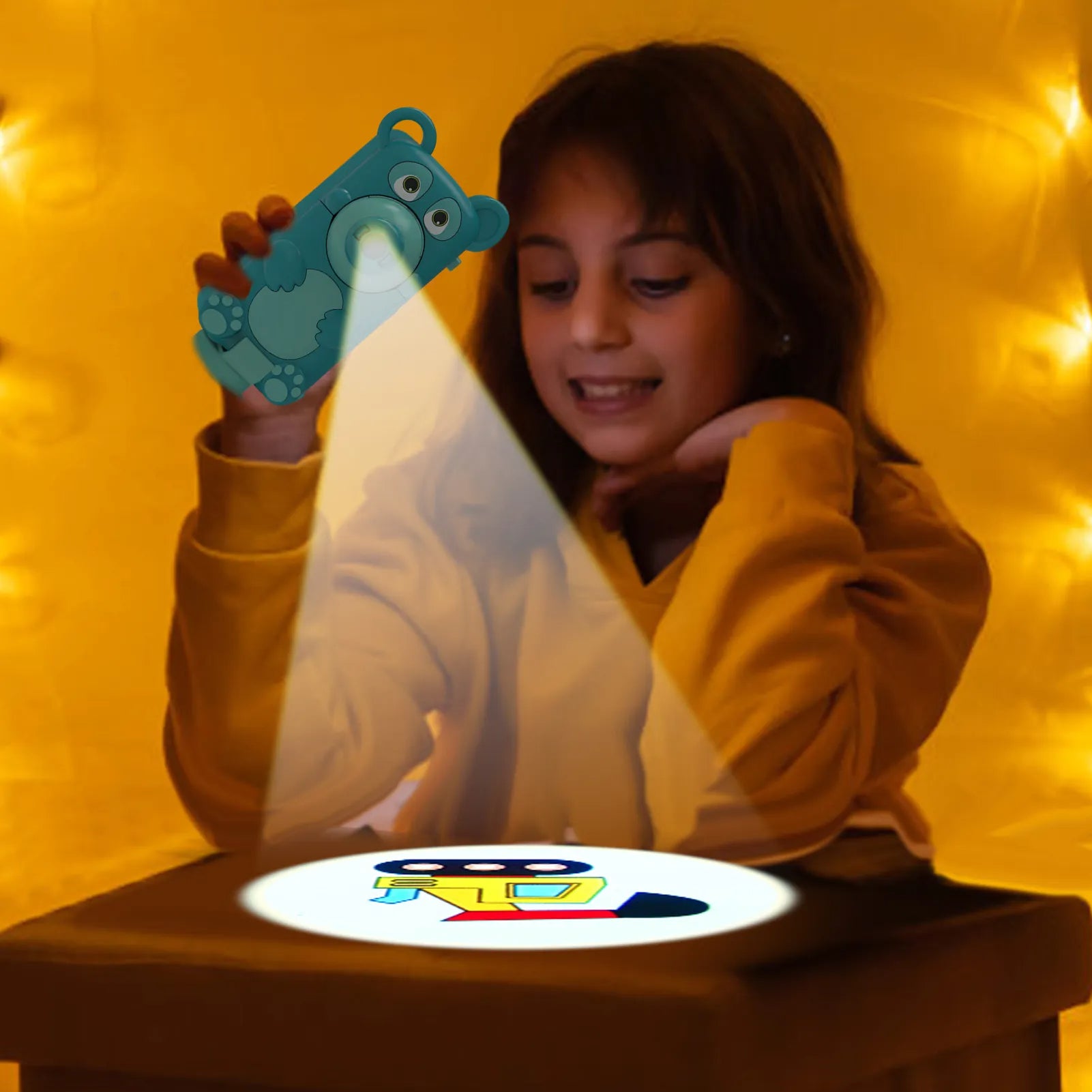 Proiectorul proiectează instantaneu o imagine viu colorata pe pereți sau pe tavan. Adăugați o notă de distracție la culcare cu mini-proiectorul. Această jucărie cu proiector promite o mulțime de distracție și divertisment pentru cei mici. Jucaria poate fi folosita ca si lanterna pe intuneric.