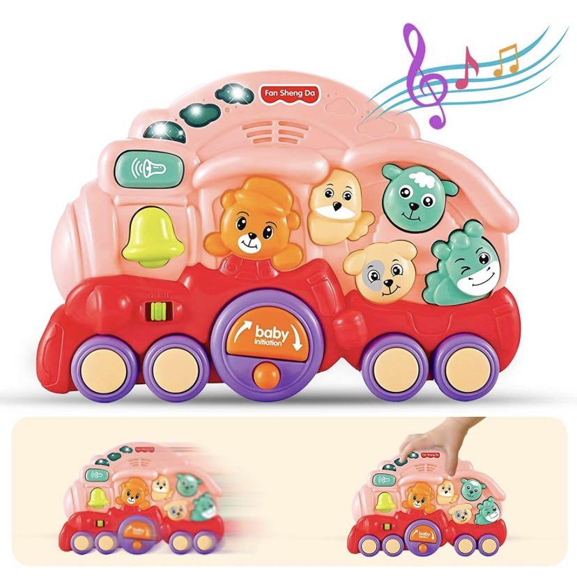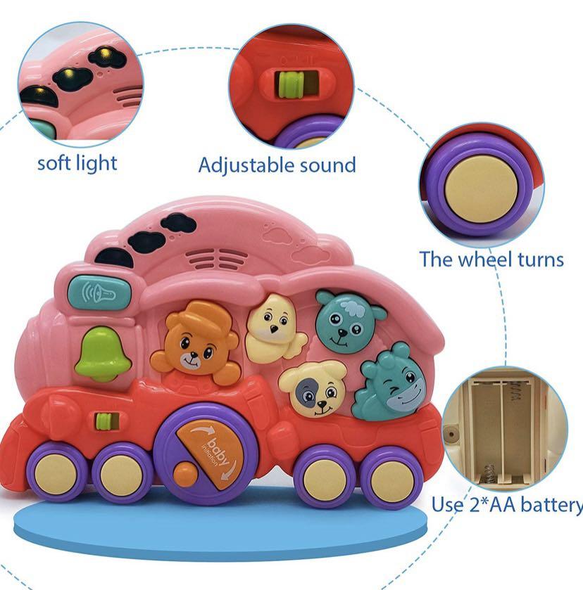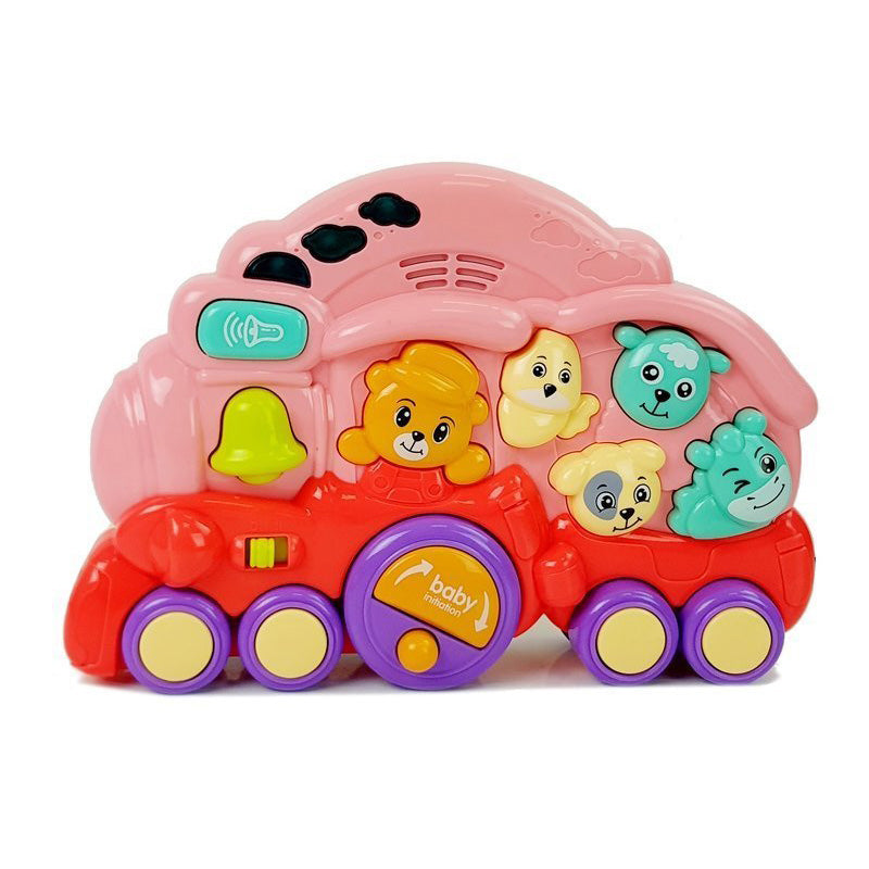 Elementele aflate pe locomotivă includ o pasăre, un câine, o oaie și un cal. Un mare avantaj al locomotivei sunt roțile mobile. În plus, jucăria are două niveluri de volum și efecte luminoase.