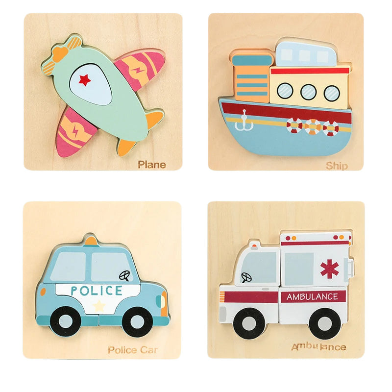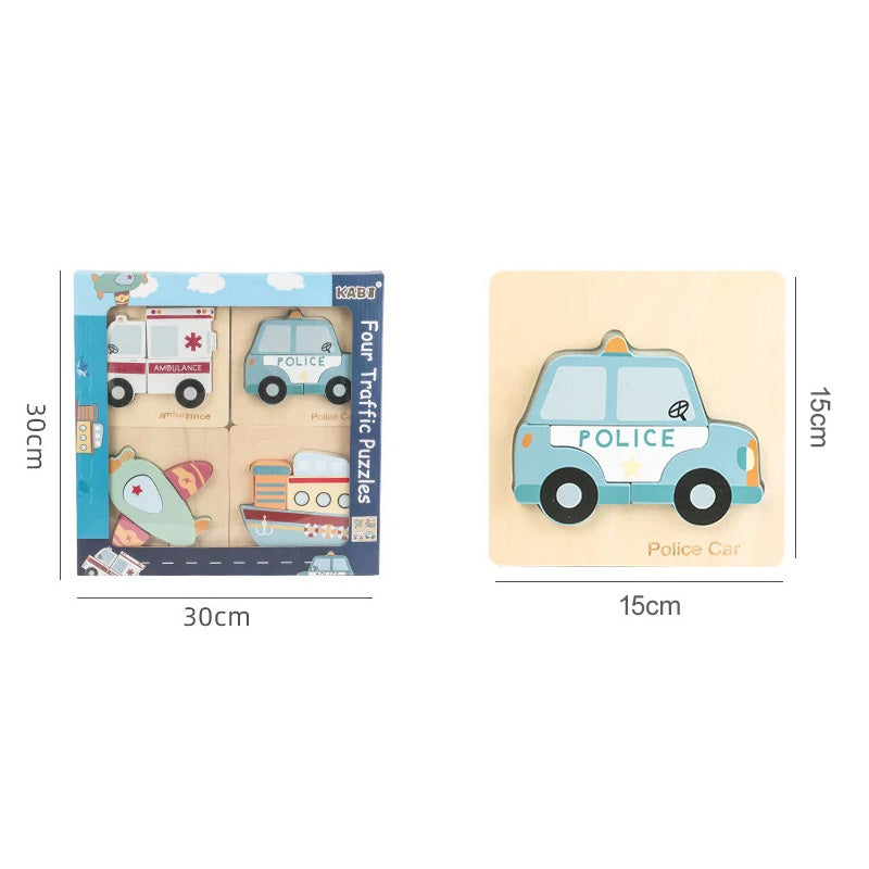 Va prezentam un set KABI format din 4 puzzle-uri cu piese groase din lemn care reprezinta cele mai indrăgite mijloace de transport ale copiilor: avion, vapor, ambulanță și mașină de poliție.