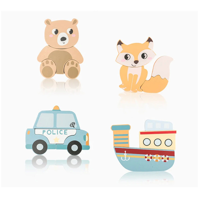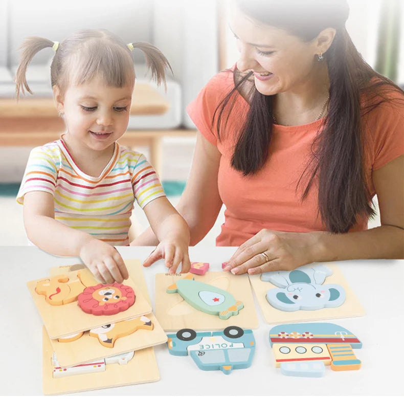 Fiecare puzzle este format din câte 4 piese mari din lemn, ușor de mânuit de către micii exploratori. Cu ajutorul acestui set, cei mici îşi vor dezvolta abilităţile de asociere şi potrivire, coordonarea mână-ochi, răbdarea şi capacitatea de a duce la bun sfârşit un proiect.