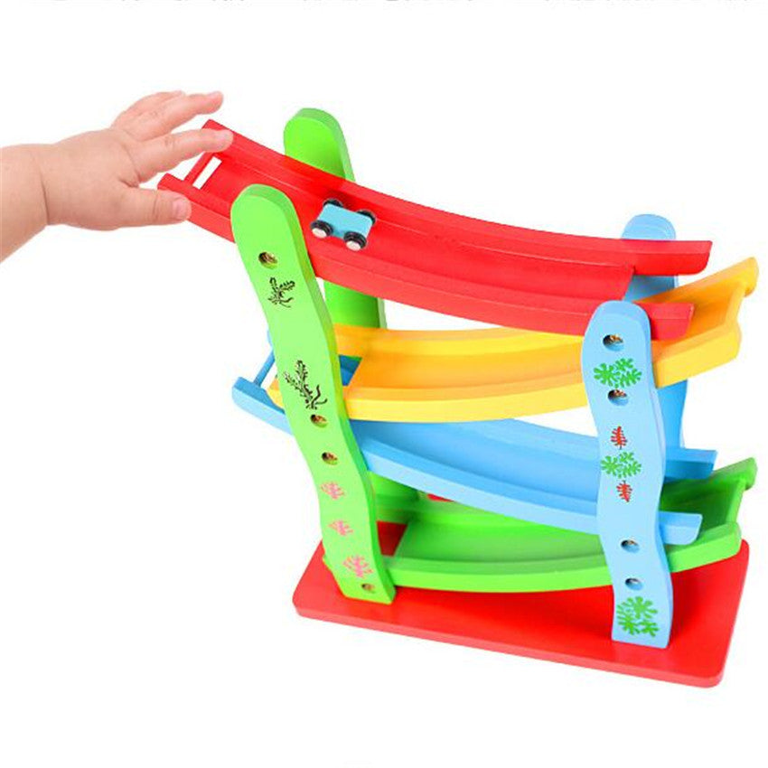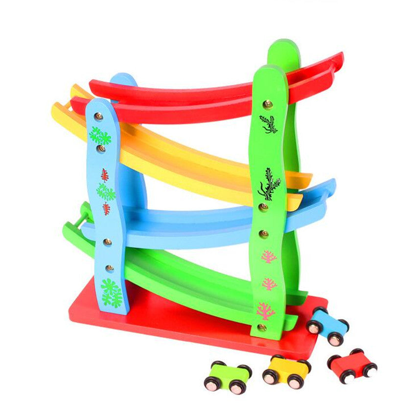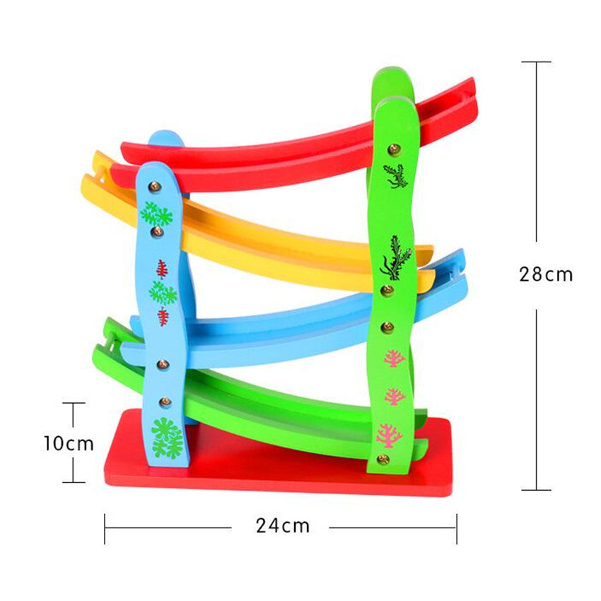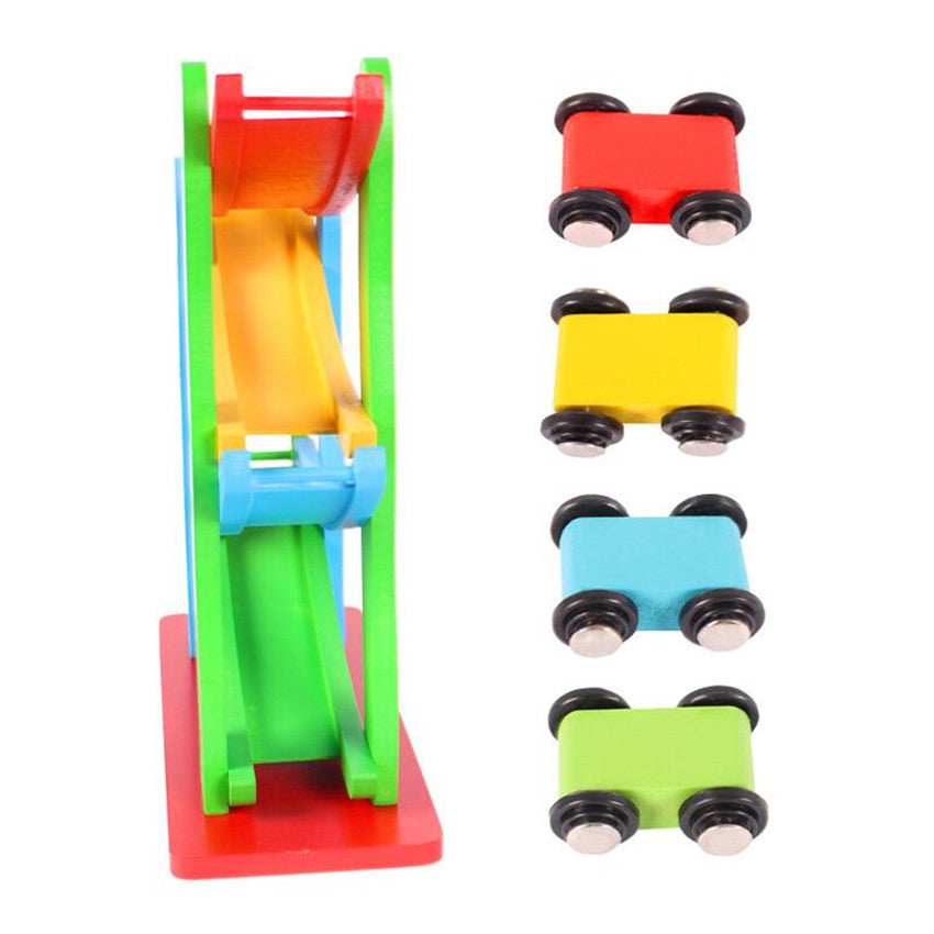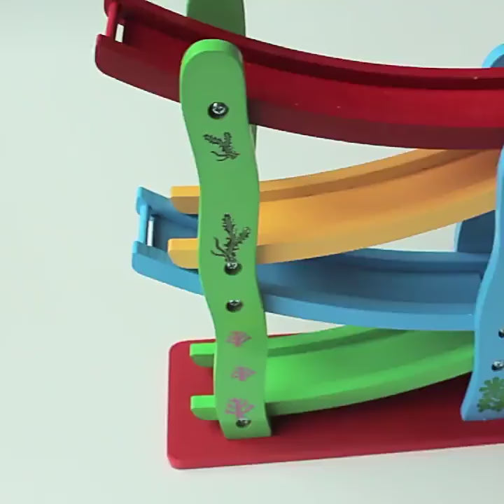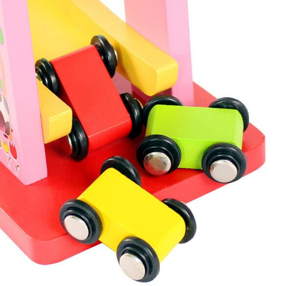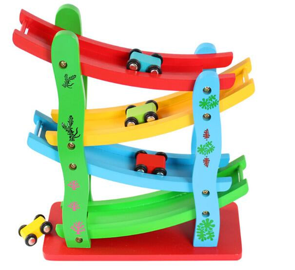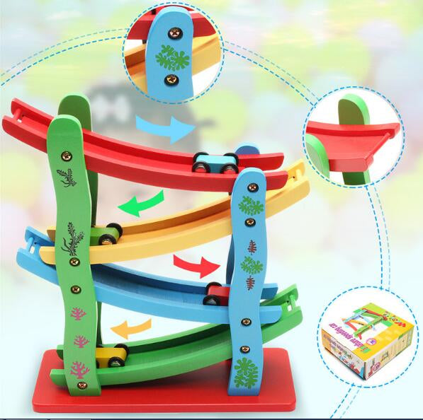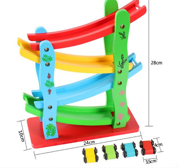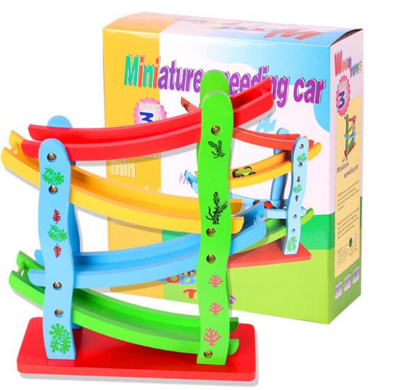 Pista de raliu din lemn cu 4 etaje si 4 masinute colorate invata copilul sa apuce si sa detina abilitati. Jucaria Montessori care va arata si invata miscarea in spatiu si viteza. O jucarie robusta pentru o distractie maxima atunci cand masinile isi fac traseul de sus pana jos.