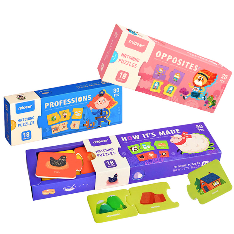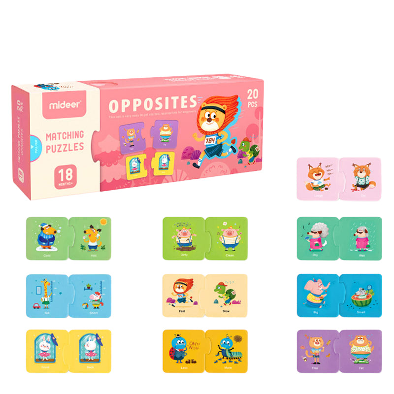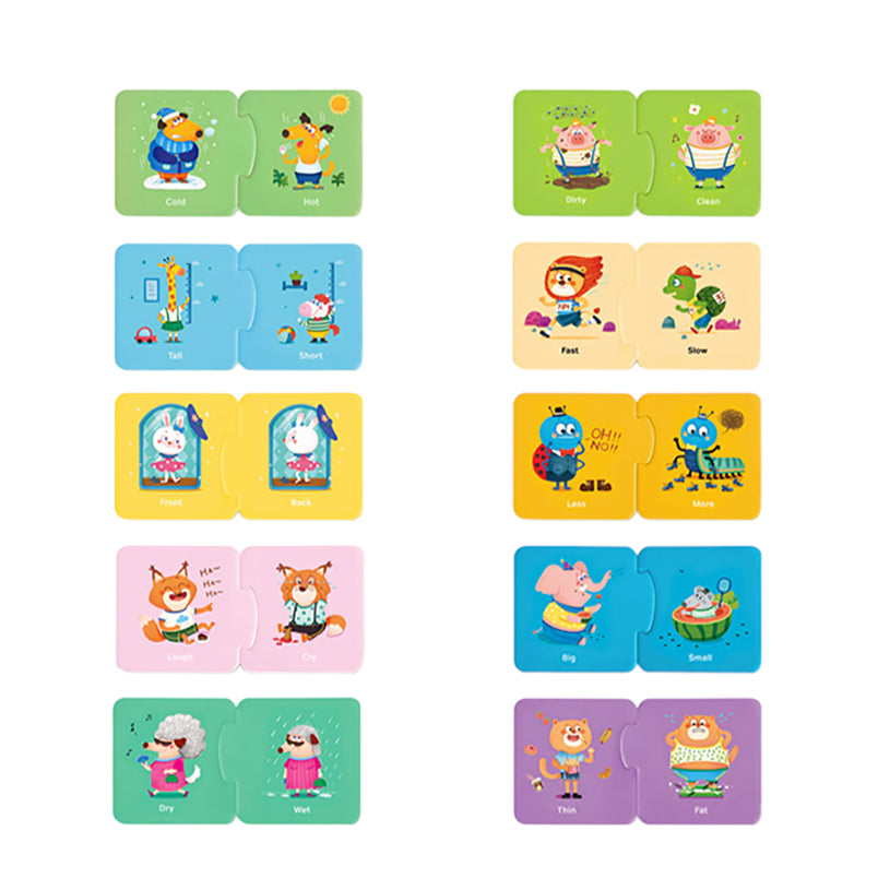 Care este opusul lui „curat” și care este opusul lui „lent”? Cu aceste puzzle-uri, cei mici vor avea sarcina de a lega termeni cu sens opus. Fiecare parte a setului are o miniatură ilustrată care arată clar termenul la care se referă, astfel încât copiii să-i recunoască semnificația și apoi să găsească o miniatură cu o ilustrare a sensului opus printre cărțile rămase.