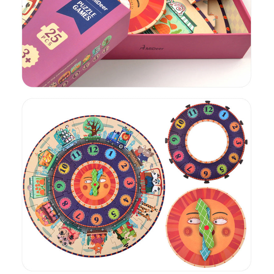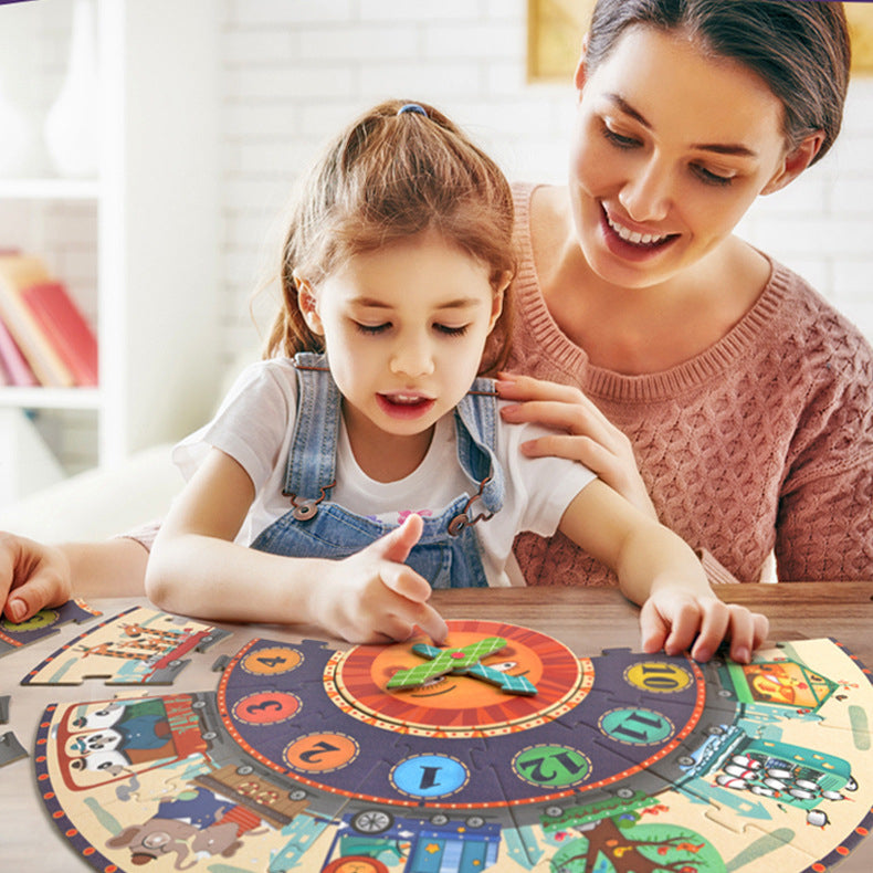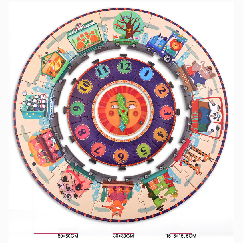 Fiecare numar al vagonului de tren se va potrivi cu numarul de pasageri de pe acesta. Cand puzzle-ul este complet, se formeaza un ceas gigant iar copilul invata sa citeasca ceasul. Piesele mari de puzzle sunt usor de prins de mainile copiilor mici.