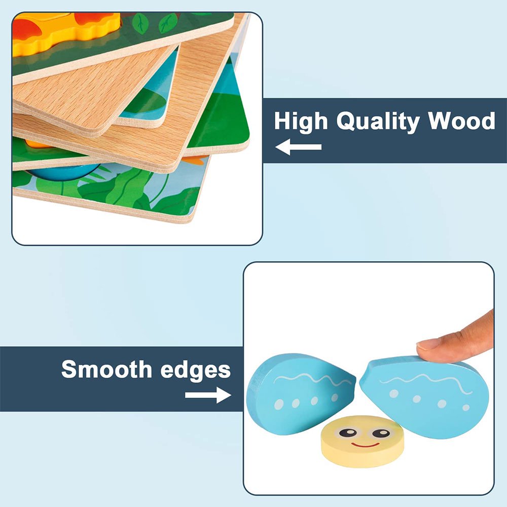 Fiecare puzzle este format din 4 până la 6 piese mari, uşor de mânuit de către micii începători şi colorate în culori vii. Această jucărie ajută la stimularea atenției, a motricității, a asocierii logice, a coordonării mână-ochi. Deasemenea, cei mici pot învăța denumirile animalelor și coloritul acestora.
