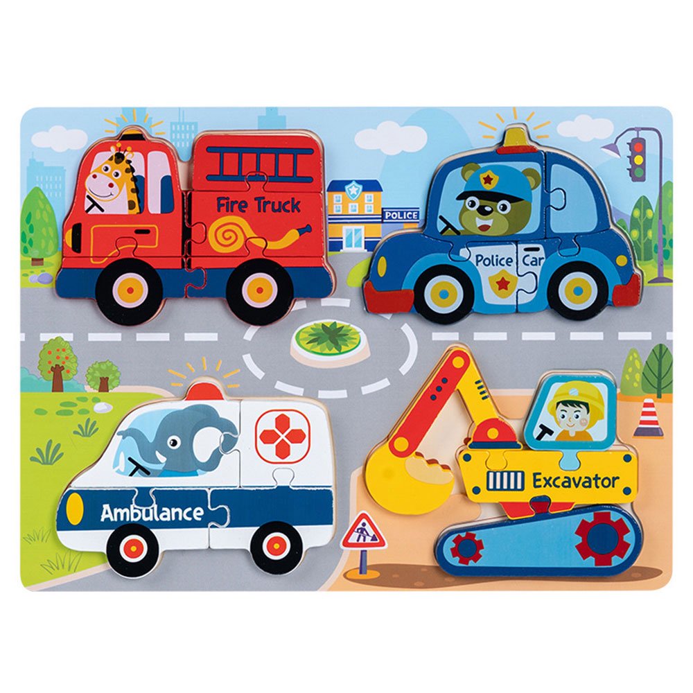 Placă din lemn și 4 puzzle-uri incastre în relief cu diferite tipuri de masini: POLITIA, POMPIERII, AMBULANTA si EXCAVATORUL si denumirile acestora in lima engleza.