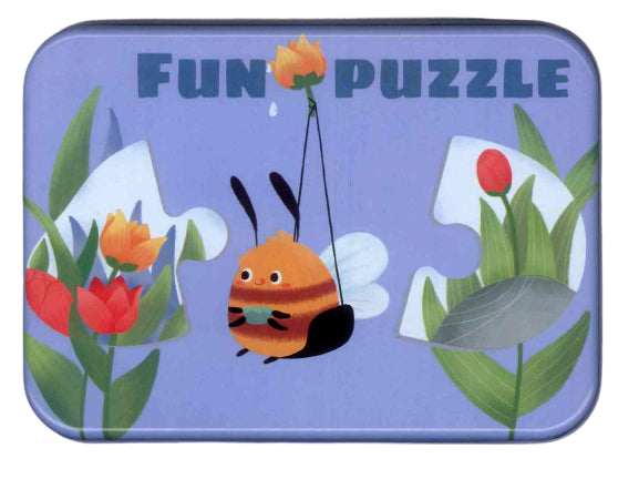Fun Puzzle in cutie metalica, contine 10 puzzle-uri cu piese din lemn cu design si imagini atragatori pentru cei mici. Imaginile puzzle-ului ilustreaza in mediul lor animalele si insectele precum catei, ursi panda, pisici, albine si altele.