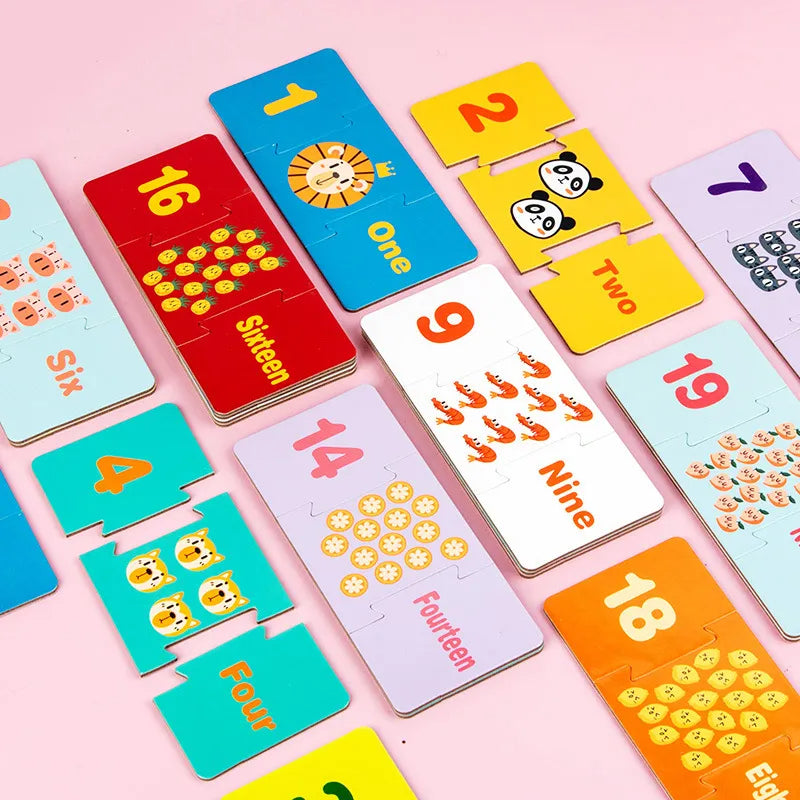 Cutia contine 20 mini seturi de puzzle de cate 3 piese (3x20 piese), frumos ilustrate pentru copii, reprezentand o tripla asociere: numere-imagini-denumire engleza.