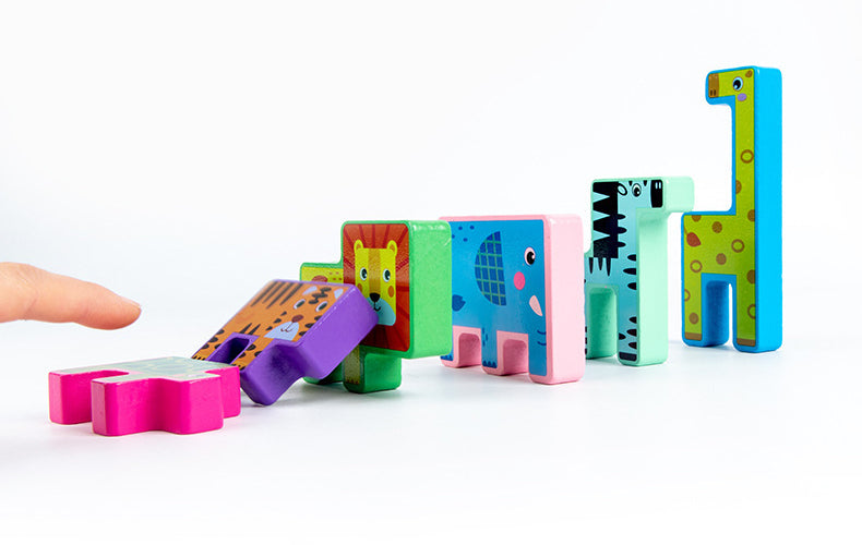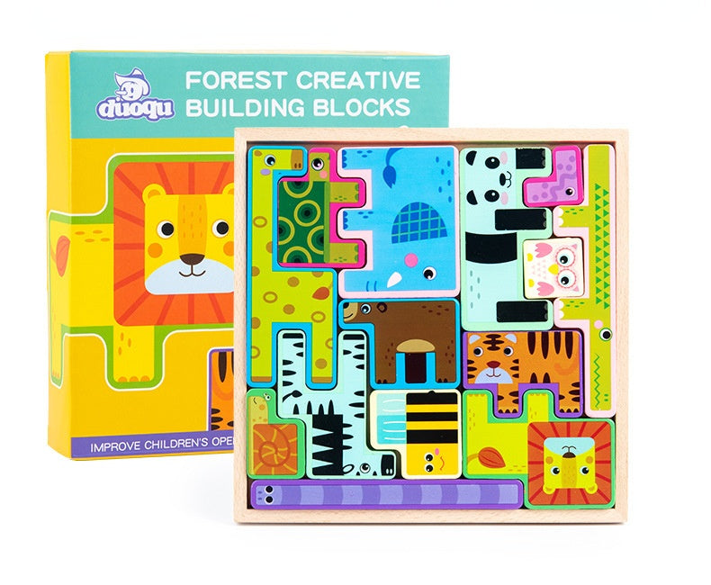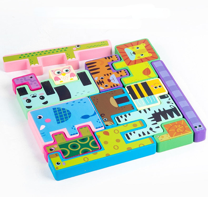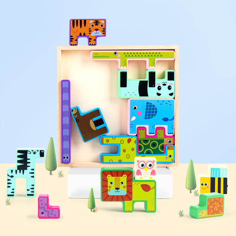 Puzzle lemn 3D cu animale junglei, de tip tetris, format din 13 piese (animale) colorate diferit, care pot fi combinate cu usurinta de cei mici pentru a forma diverse figurine, dar pot forma si imbinarile ce stau la baza jocului de tip tetris, stimuland creativitatea, gandirea logica, indemanarea si perspicacitatea.