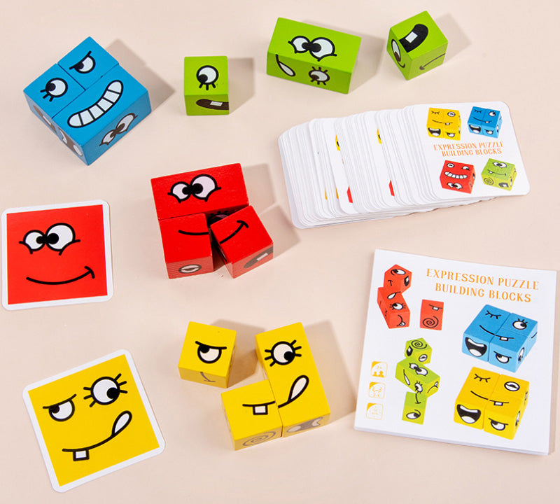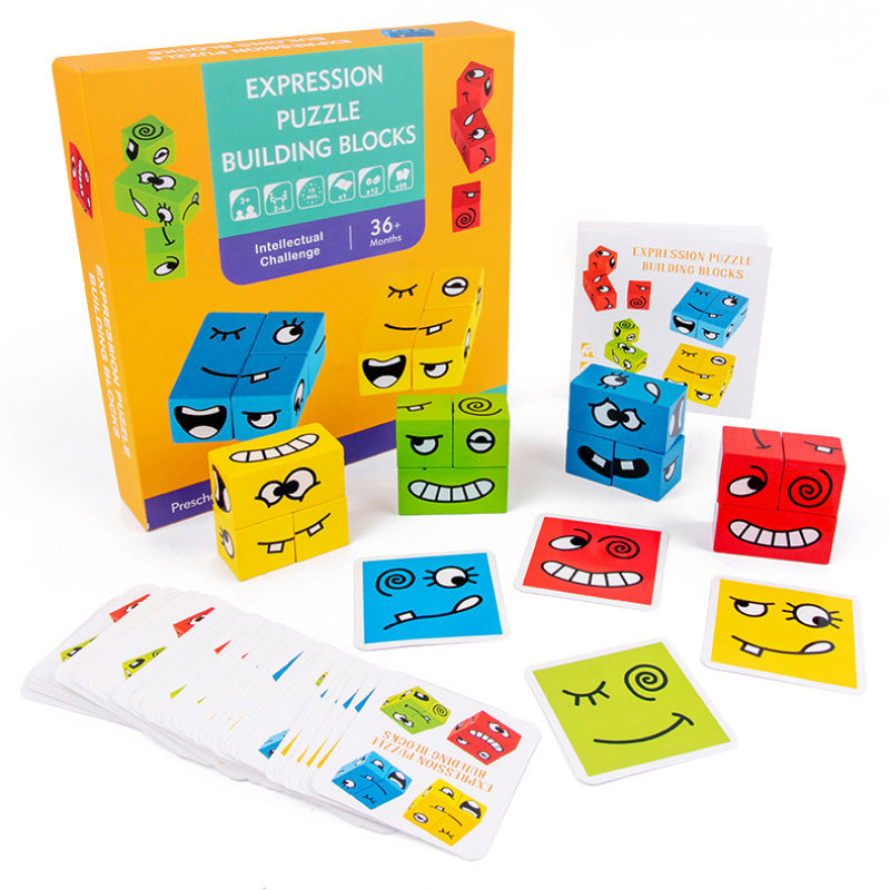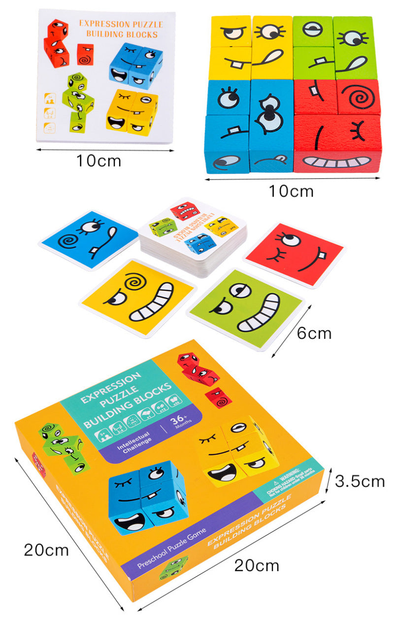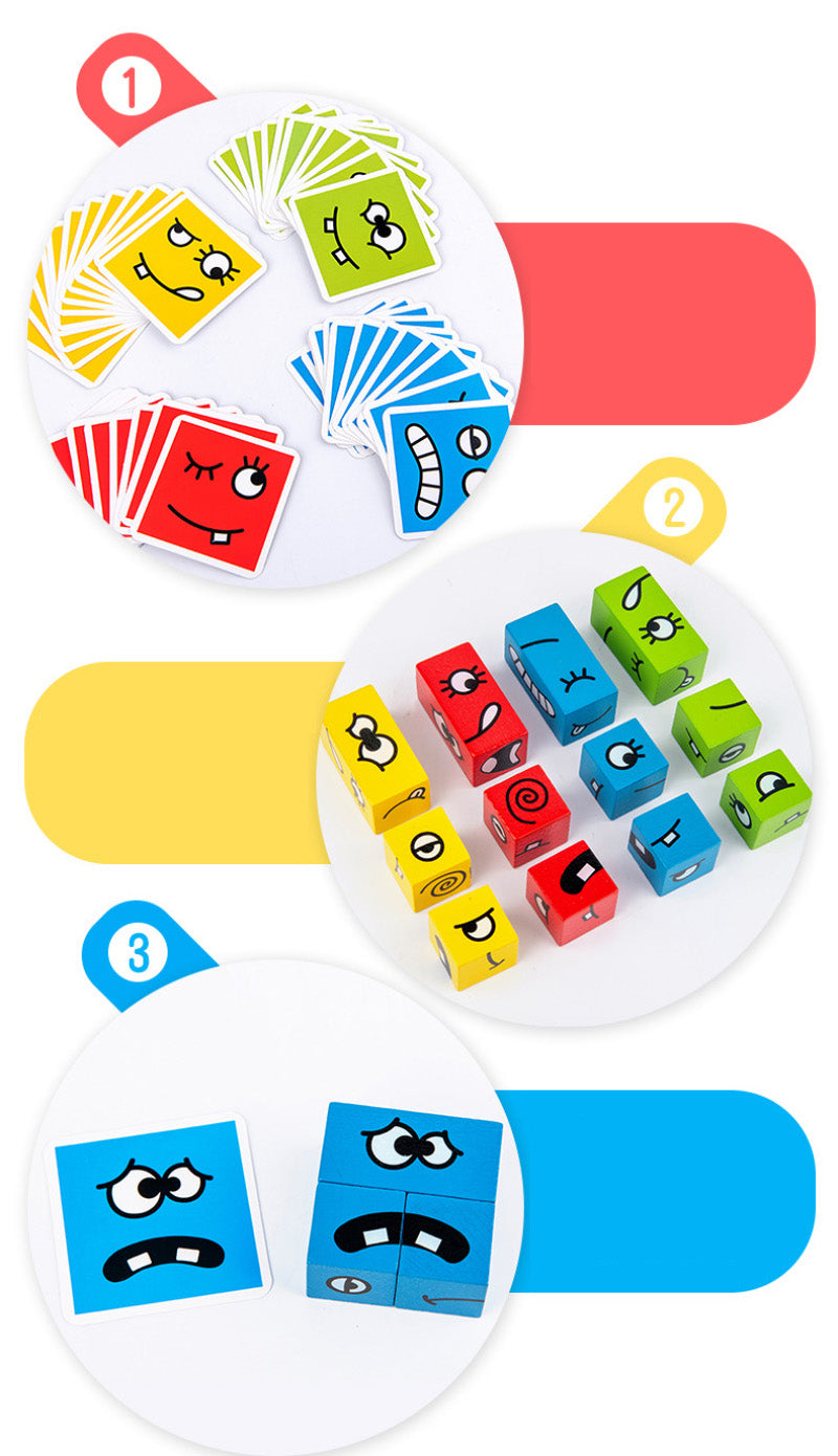 Include 12 cuburi colorate din lemn si 50 cartonase cu modele pentru expresii faciale.