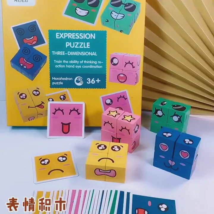 Pentru a realiza diferite expresii, foloseste cartonasele cu modele. Jocul este educativ, folosindu-se si conceptul de puzzle, pentru a potrivi corect. Copii vor fi incantati de variatiile incluse si de multele posibilitati de combinare a cuburilor.