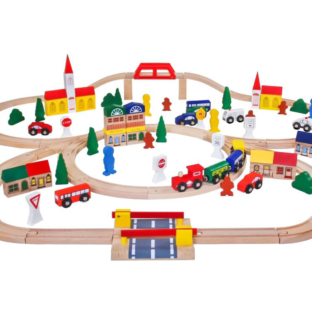 Va prezentam un mega set incredibil de trenulete din lemn pentru copii, de tip Montessori. Setul este format din 100 de piese. Jucaria poate fi asezata pe o cale ferata mare pe care pot rula toate vehiculele din set.
